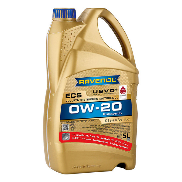 RAVENOL ECS 0W-20 – је потпуно синтетичко моторно уље ниског трења направљено коришћењем CleanSynto® и USVO® за путничке бензинске и дизел моторе са и без турбо пуњења и директним убризгавањем горива.