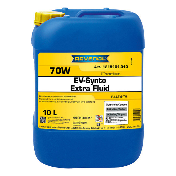 RAVENOL EV-Synto Extra Fluid 70W E-TF је идеалан за употребу током целе године у свим модерним електричним возилима. Специјални пакет адитива задовољава захтеве многих произвођача оригиналне опреме (OEM).