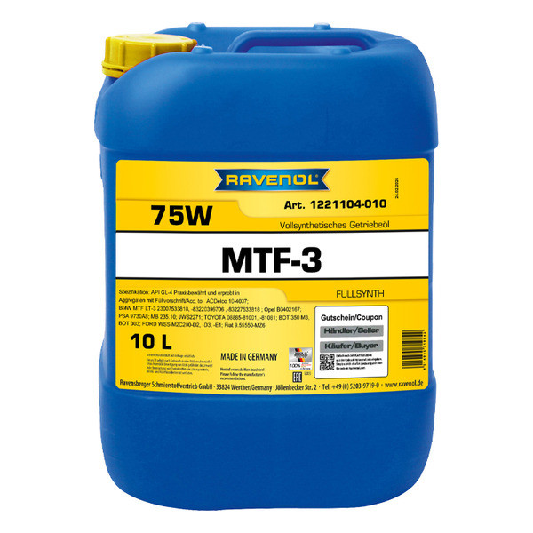 RAVENOL MTF-3 SAE 75W развијен на бази специјално одабраног базног уља са додатком комплекса адитива. Испуњава савремене захтеве. RAVENOL MTF-3 SAE 75W користи се при високим механичким и термичким оптерећењима, обезбеђује продужен интервал замене.